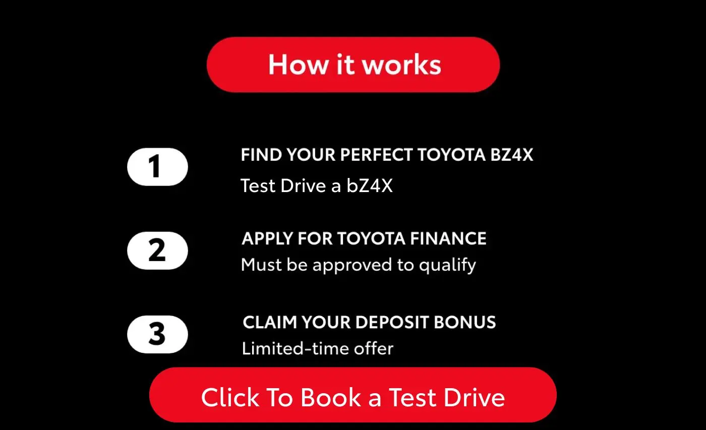 For a limited time, when you finance a new all-electric Toyota bZ4X with Toyota Finance, we’ll add a $5,000 deposit bonus on 2WD models or a $7,500 deposit on AWD models to help you get behind the wheel sooner!
